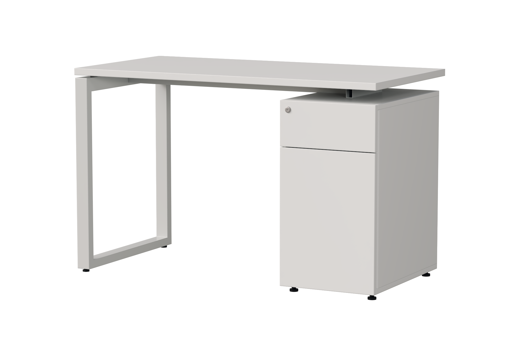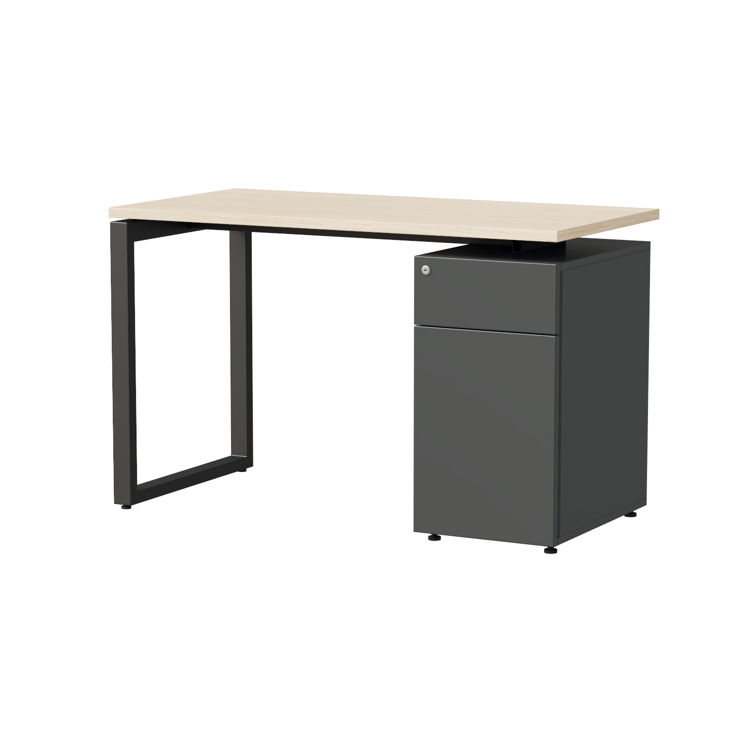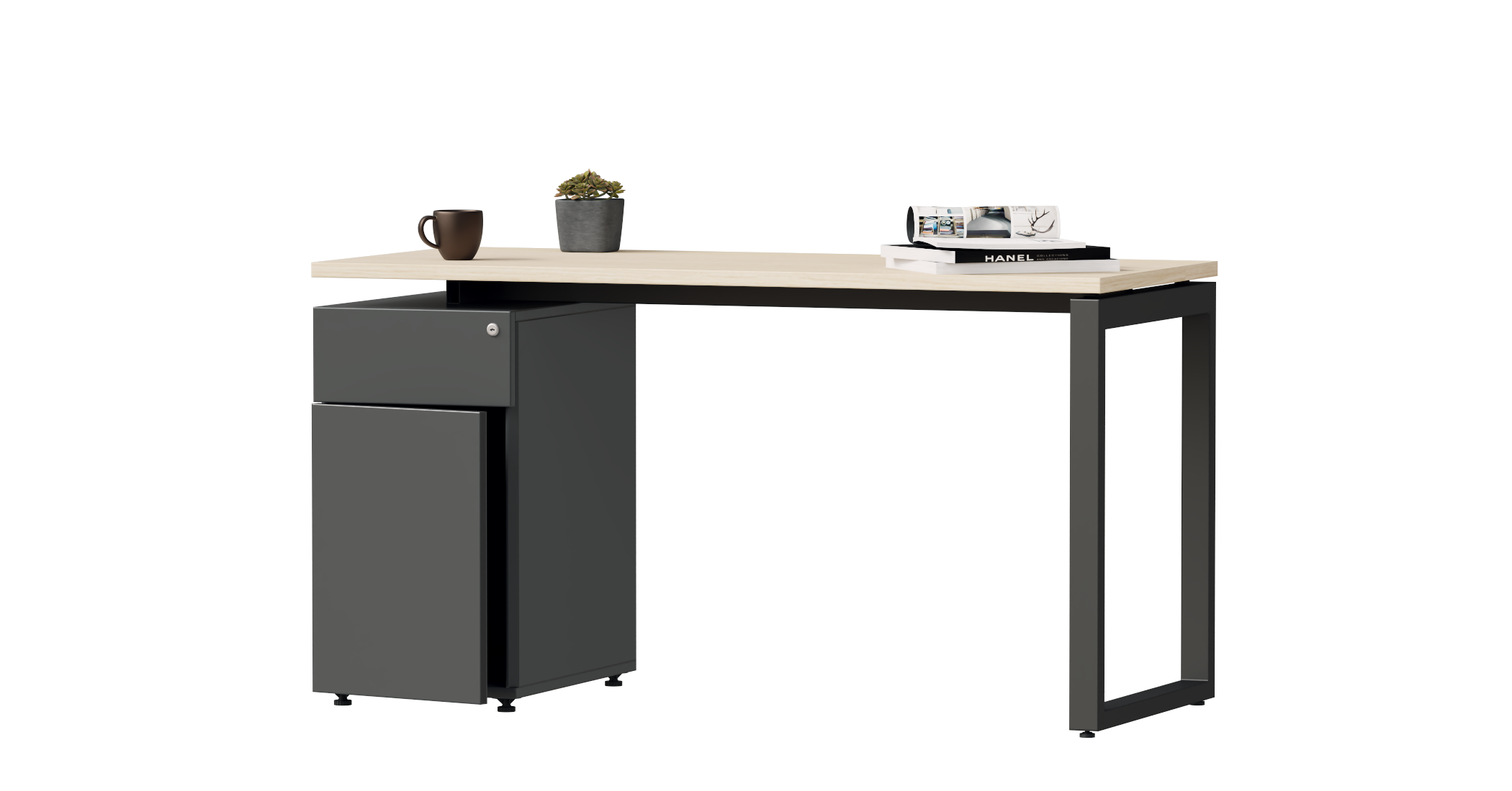 Tích hợp giữa bàn làm việc và tủ lưu trữ, thiết kế bàn có tủ nối liền mang đến giải pháp nội thất tiện dụng, giúp tối ưu hóa không gian làm việc mà vẫn đảm bảo sự gọn gàng và thẩm mỹ. Tủ được bố trí sát cạnh bàn, bao gồm một ngăn kéo nhỏ và một khoang tủ cánh mở lớn – vừa đủ để cất giữ các vật dụng cá nhân như balo, túi xách hoặc hồ sơ, tài liệu cần thiết.