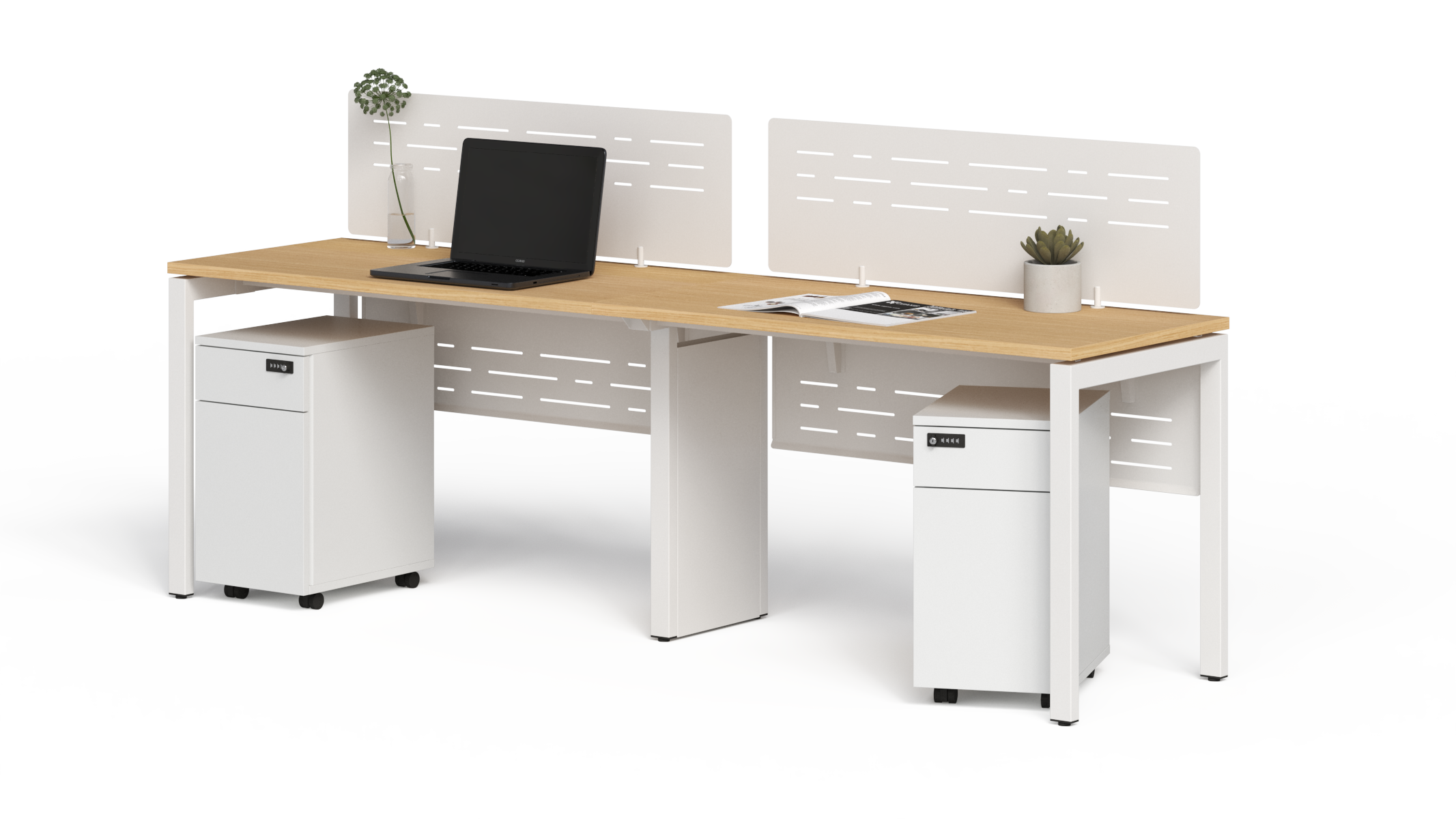 Thiết kế bàn có tủ nối liền với bàn giúp tiết kiệm không gian lưu trữ. Tạo không gian lưu trữ cho mỗi góc cá nhân mà không cần sử dụng thêm các tủ di động rời cho mỗi góc làm việc.