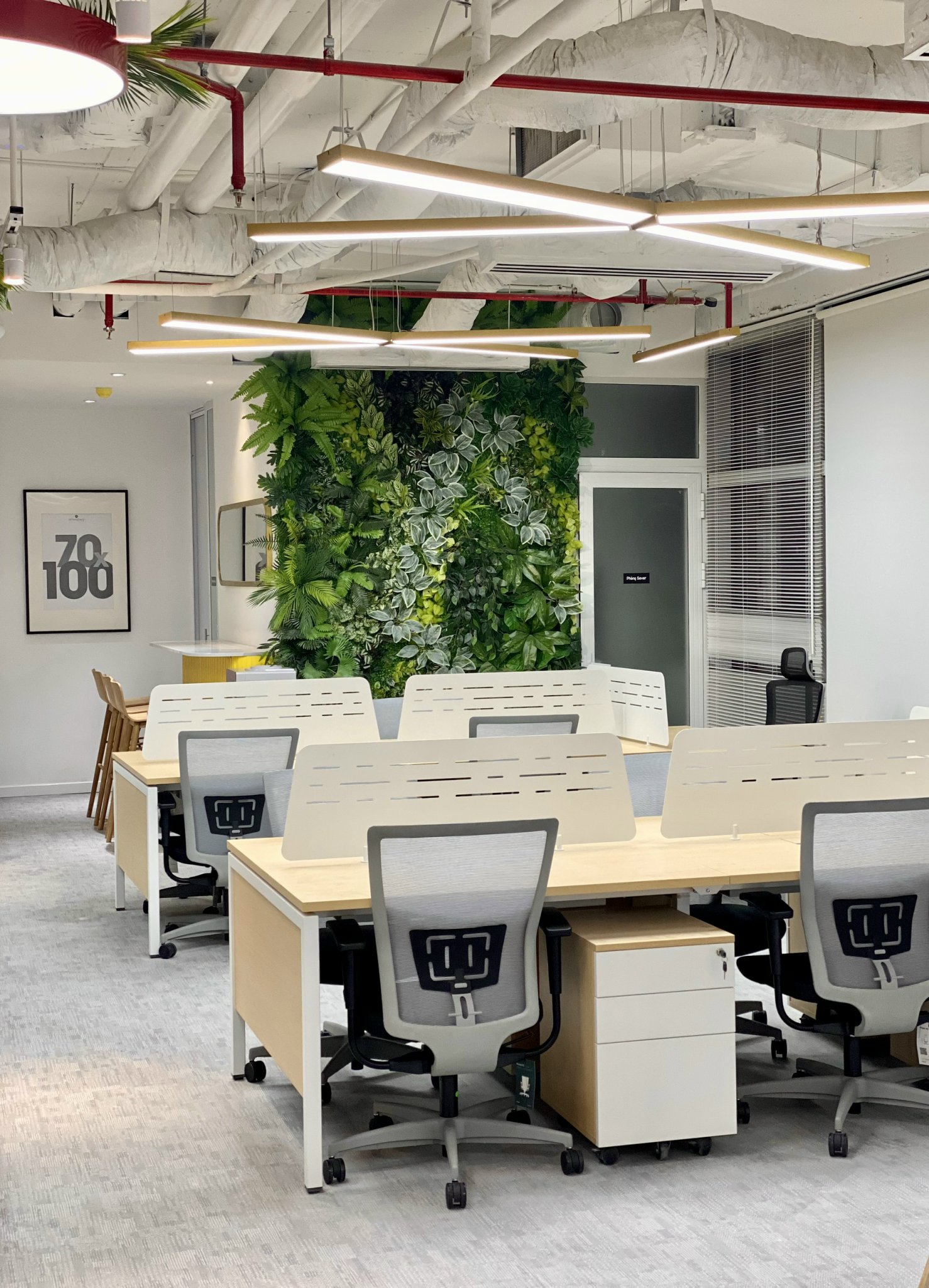 Thiết kế bàn làm việc đơn giản, với sự kết hợp giữa chân kim loại sơn tĩnh điện trắng và mặt bàn vân gỗ sáng màu tạo cảm giác rộng rãi hơn cho căn phòng. Tone màu sáng được ứng dụng nhằm tạo sự thông thoáng cho không gian. Phần tủ hồ sơ thấp kết hợp làm tủ cây trang trí, tăng tính thẩm mỹ và tiện lợi hơn cho văn phòng.