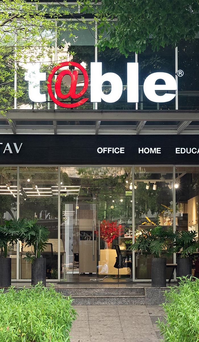 Showroom của t@ble tọa lạc tại khu Sala, với diện tích 300m² gồm 3 tầng trưng bày, showroom được thiết kế như một văn phòng hoàn chỉnh, giúp khách hàng dễ dàng hình dung sản phẩm trong không gian làm việc thực tế. Tại đây, t@ble mang đến đa dạng mẫu mã bàn ghế, tủ kệ, được bố trí khoa học, hiện đại, kết hợp ánh sáng tự nhiên và bố cục mở để tạo nên trải nghiệm mua sắm thoải mái, đầy cảm hứng.